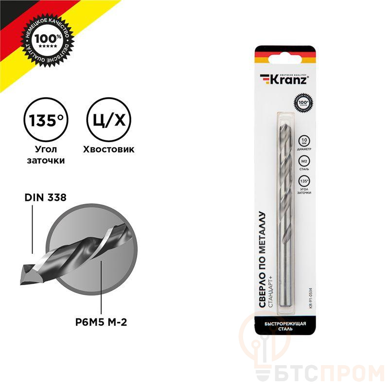 Сверло по металлу 10мм "Стандарт+" (P6M5 M-2) DIN 338 (блист.1шт) Kranz KR-91-0534 фото в каталоге от BTSprom.by