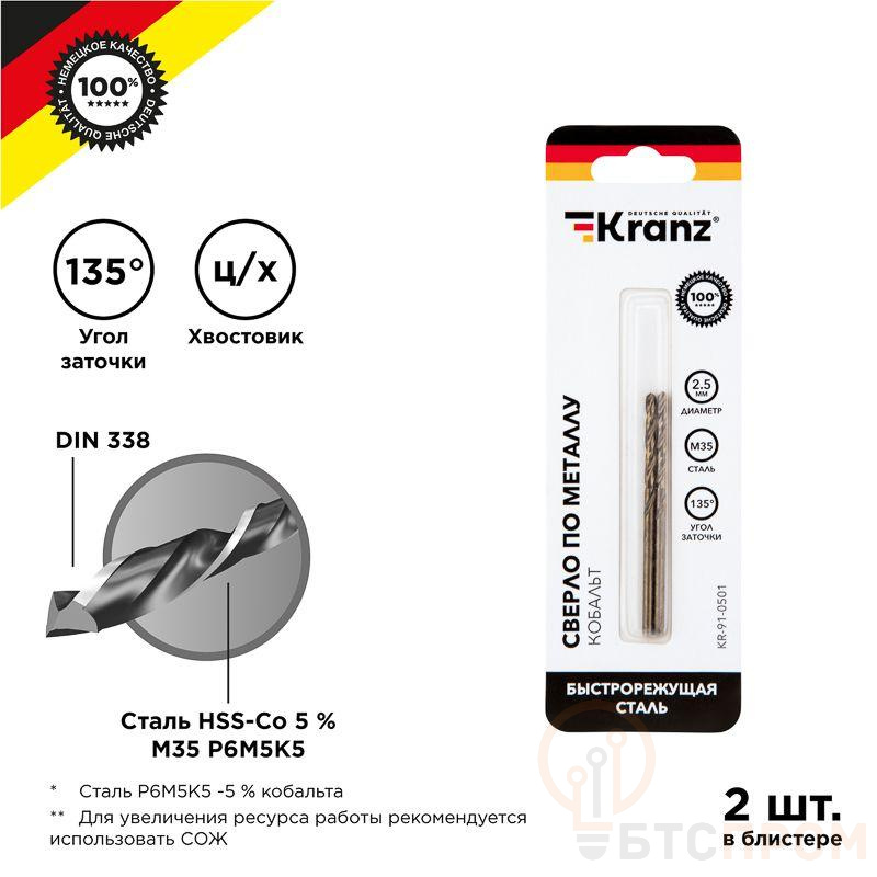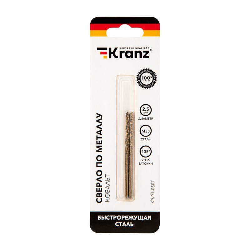 Сверло по металлу KRANZ изготовлено по стандарту DIN 338 и используется для сверления отверстий в таких материалах, как сталь, чугун, нержавеющая сталь, легированные и цветные металлы. Имеет цилиндрический хвостовик, применяется совместно с дрелями, шуруповертами и станками. Изделие выполнено из качественной быстрорежущей стали М35 (Р6М5К5) с добавлением 5% кобальта, что обеспечивает стойкость к перегреву, долгий срок службы и высокую эффективность. Благодаря заточке режущей части под углом 135 градусов достигается более эффективный вход оснастки в материал, что приводит к увеличению ресурса эксплуатации и сокращению износа сверла. Благодяря вышлифованному профилю сверло сохраняет точное положение во время сверления, что гарантирует получение ровных и аккуратных отверстий без трещин и сколов.