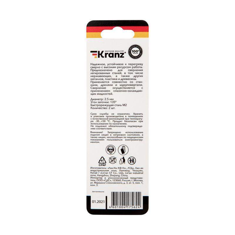 Сверло по металлу KRANZ изготовлено по стандарту DIN 338 и используется для сверления отверстий в таких материалах, как сталь, чугун, нержавеющая сталь, цветные металлы и пластик. Применяется совместно с дрелями, шуруповертами и станками с цилиндрическим типом крепления. Изделие выполнено из качественной стали М2 (Р6М5), что обеспечивает высокую производительность, а также препятствует быстрому перегреву во время использования. Режущая часть инструмента заточена под углом 135 градусов, что способствует более эффективному проникновению в материал, уменьшая износ сверла. Благодяря вышлифованному профилю сверло сохраняет точное положение во время сверления, благодаря чему создаваемые отверстия приобретают ровную и аккуратную форму. Ресурс использования инструмента заметно увеличивается при использовании смазочно-охлаждающих жидкостей.