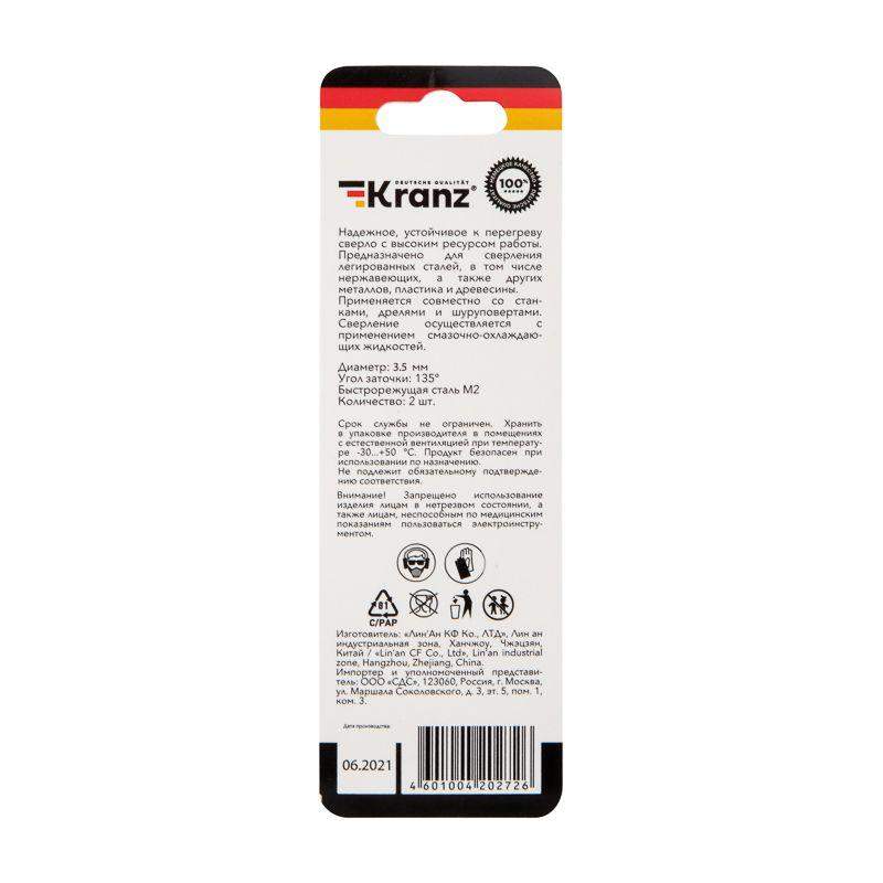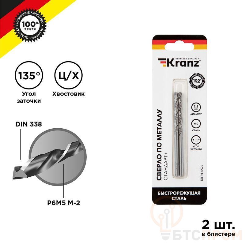 –Сверло по металлу 3.5х70х39мм "Стандарт+" (P6M5 M-2) DIN 338 (блист.2шт) Kranz KR-91-0527