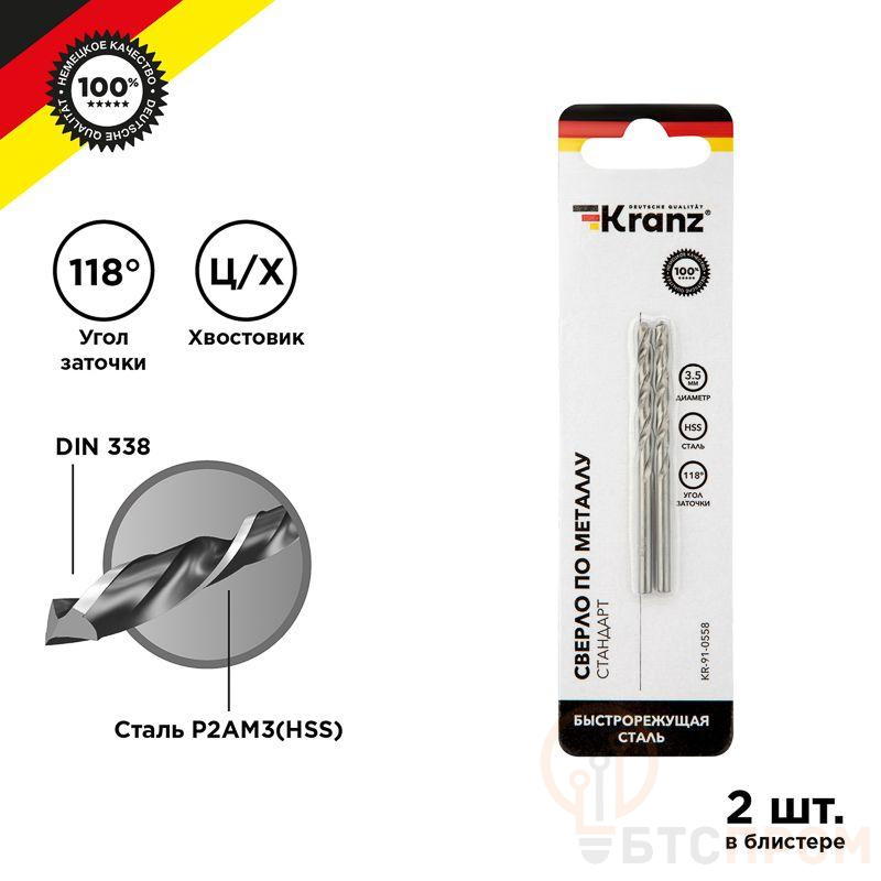 Сверло KRANZ изготовлено по стандарту DIN 338 и используется для сверления отверстий в таких материалах, как сталь, дерево и пластик. Применяется с дрелями, шуруповертами и станками с цилиндрическим типом крепления. Продукт изготовлен из быстрорежущей стали HSS, благодаря чему отличается высокой производительностью и долгим сроком эксплуатации. Конструкция с прокатным типом спирали сохраняет точное положение оснастки во время сверления, что гарантирует ровные и аккуратные отверстия без сколов и трещин. Заточка режущей части под углом 118 градусов обеспечивает эффективный вход в материал, уменьшая износ сверла.