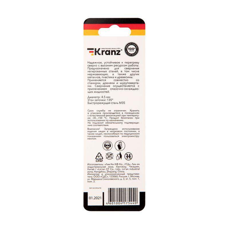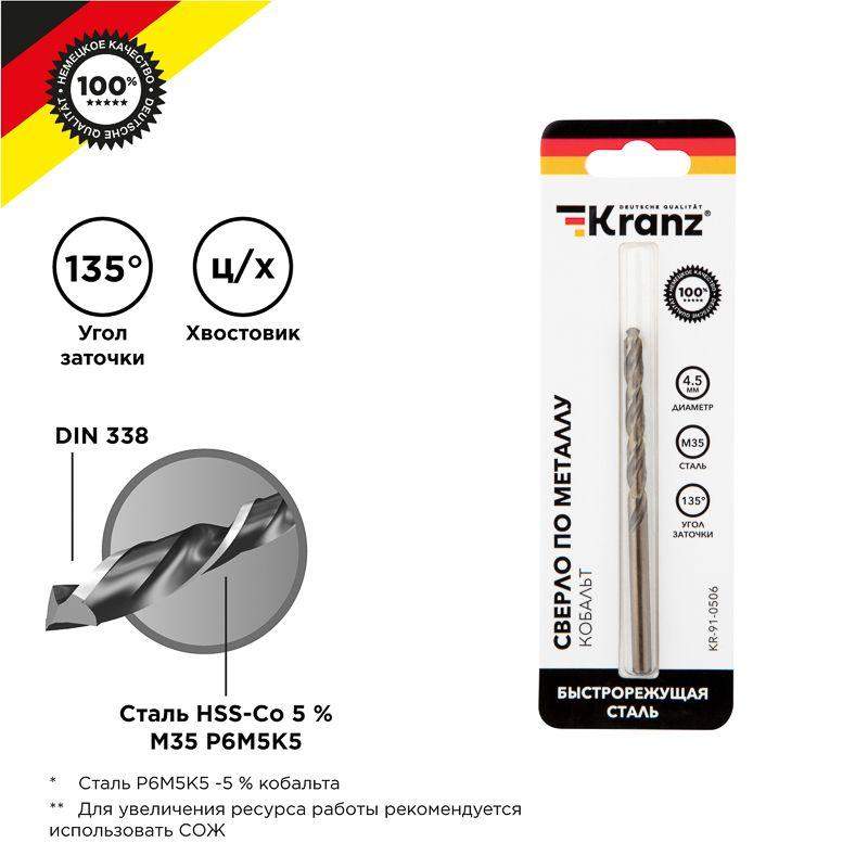 Сверло по металлу KRANZ изготовлено по стандарту DIN 338 и используется для сверления отверстий в таких материалах, как сталь, чугун, нержавеющая сталь, легированные и цветные металлы. Имеет цилиндрический хвостовик, применяется совместно с дрелями, шуруповертами и станками. Изделие выполнено из качественной быстрорежущей стали М35 (Р6М5К5) с добавлением 5% кобальта, что обеспечивает стойкость к перегреву, долгий срок службы и высокую эффективность. Благодаря заточке режущей части под углом 135 градусов достигается более эффективный вход оснастки в материал, что приводит к увеличению ресурса эксплуатации и сокращению износа сверла. Благодяря вышлифованному профилю сверло сохраняет точное положение во время сверления, что гарантирует получение ровных и аккуратных отверстий без трещин и сколов.