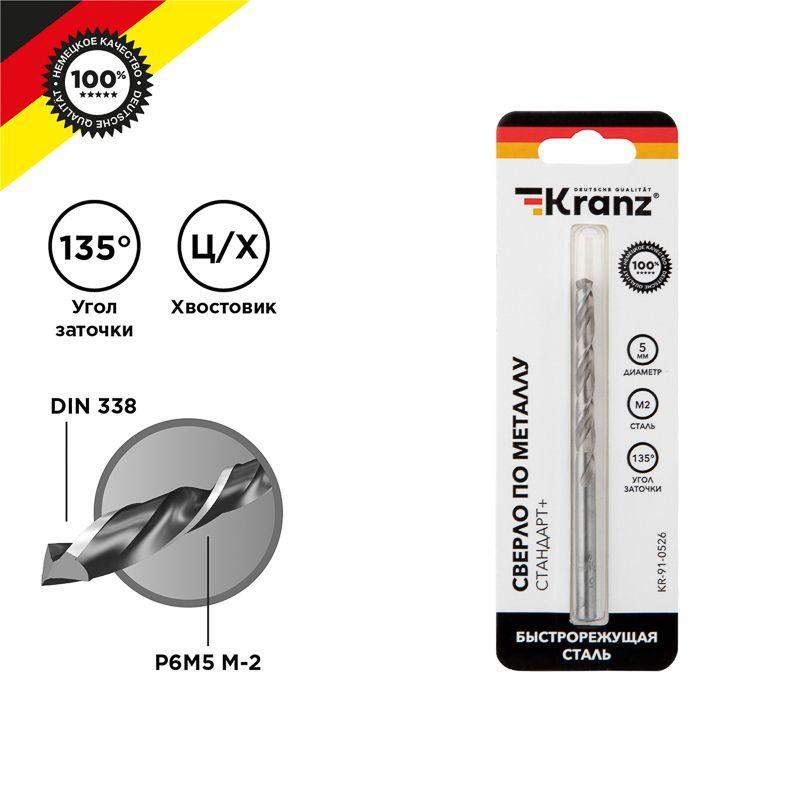 Сверло по металлу 5мм "Стандарт+" (P6M5 M-2) DIN 338 (блист.1шт) Kranz KR-91-0526 фото в каталоге от BTSprom.by