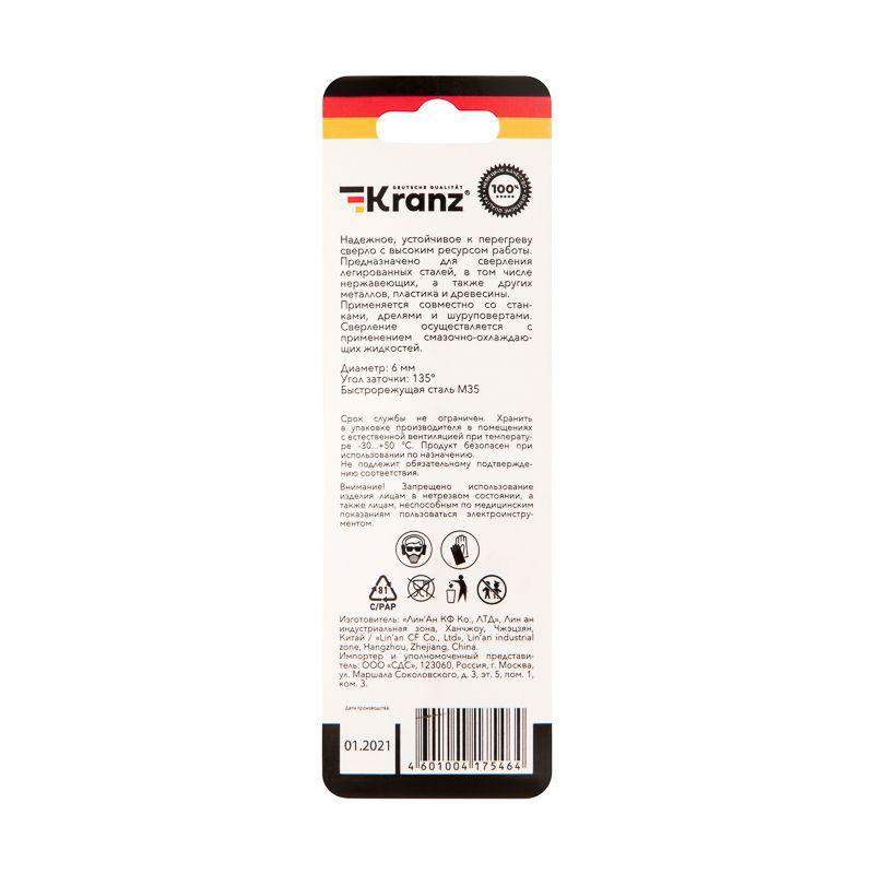 Сверло по металлу 6мм "Кобальт" (сталь HSS-Co 5% M35 P6M5K5) DIN 338 (блист.1шт) Kranz KR-91-0508