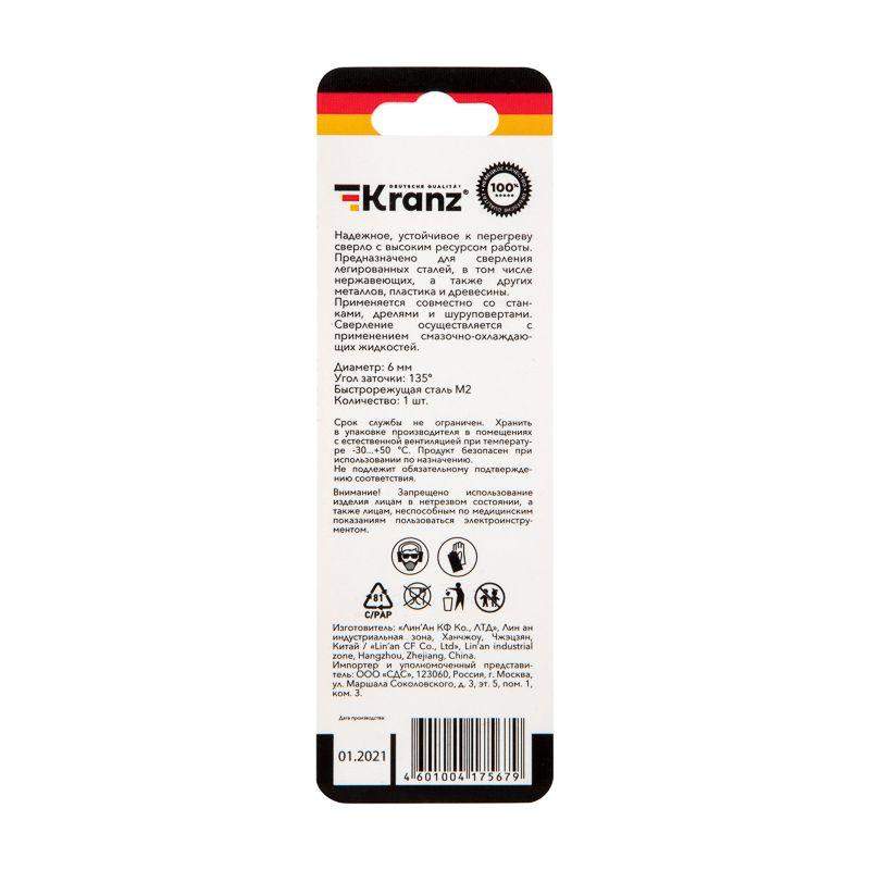 Сверло по металлу KRANZ изготовлено по стандарту DIN 338 и используется для сверления отверстий в таких материалах, как сталь, чугун, нержавеющая сталь, цветные металлы и пластик. Применяется совместно с дрелями, шуруповертами и станками с цилиндрическим типом крепления. Изделие выполнено из качественной стали М2 (Р6М5), что обеспечивает высокую производительность, а также препятствует быстрому перегреву во время использования. Режущая часть инструмента заточена под углом 135 градусов, что способствует более эффективному проникновению в материал, уменьшая износ сверла. Благодяря вышлифованному профилю сверло сохраняет точное положение во время сверления, благодаря чему создаваемые отверстия приобретают ровную и аккуратную форму. Ресурс использования инструмента заметно увеличивается при использовании смазочно-охлаждающих жидкостей.