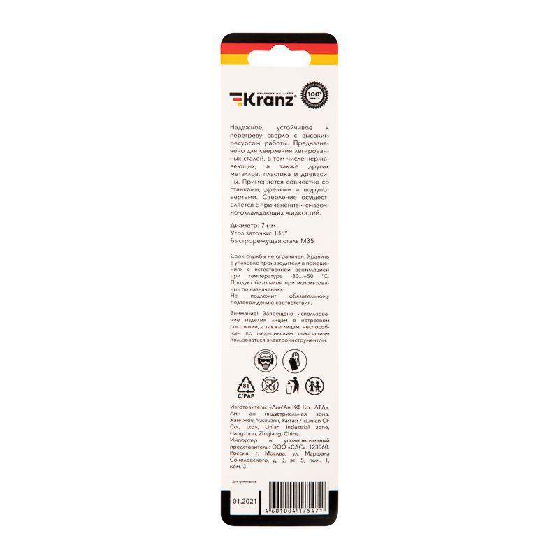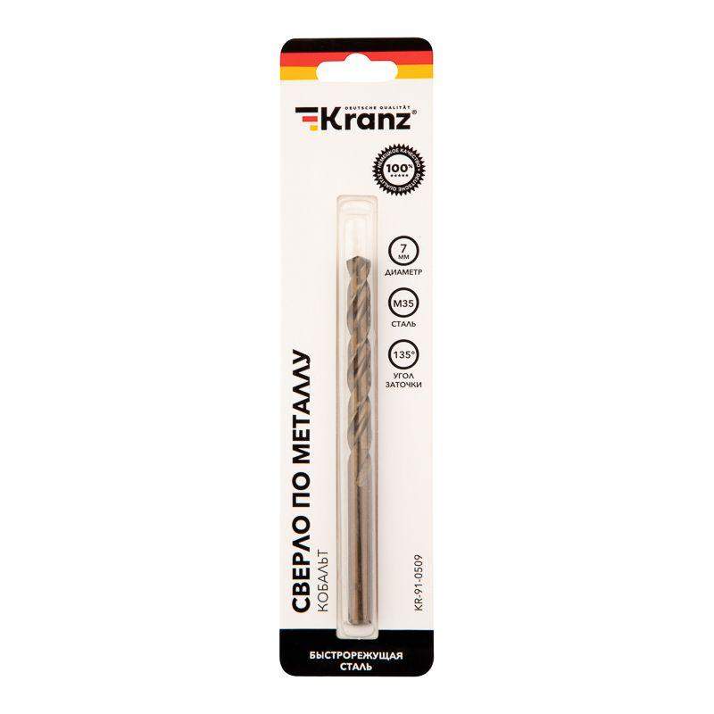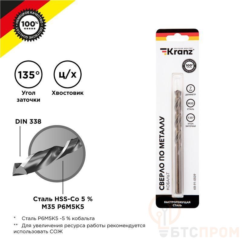 –Сверло по металлу 7мм "Кобальт" (сталь HSS-Co 5% M35 P6M5K5) DIN 338 (блист.1шт) Kranz KR-91-0509