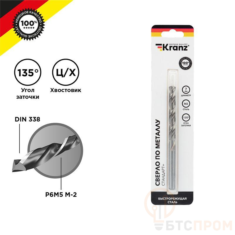 Сверло по металлу 7мм "Стандарт+" (P6M5 M-2) DIN 338 (блист.1шт) Kranz KR-91-0530 фото в каталоге от BTSprom.by