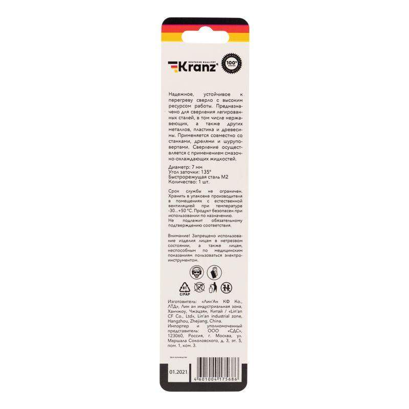 –Сверло по металлу 7мм "Стандарт+" (P6M5 M-2) DIN 338 (блист.1шт) Kranz KR-91-0530