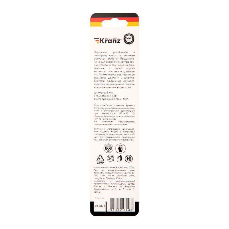 Сверло по металлу 8мм "Кобальт" (сталь HSS-Co 5% M35 P6M5K5) DIN 338 (блист.1шт) Kranz KR-91-0510