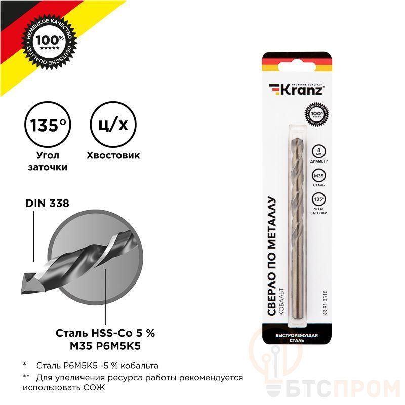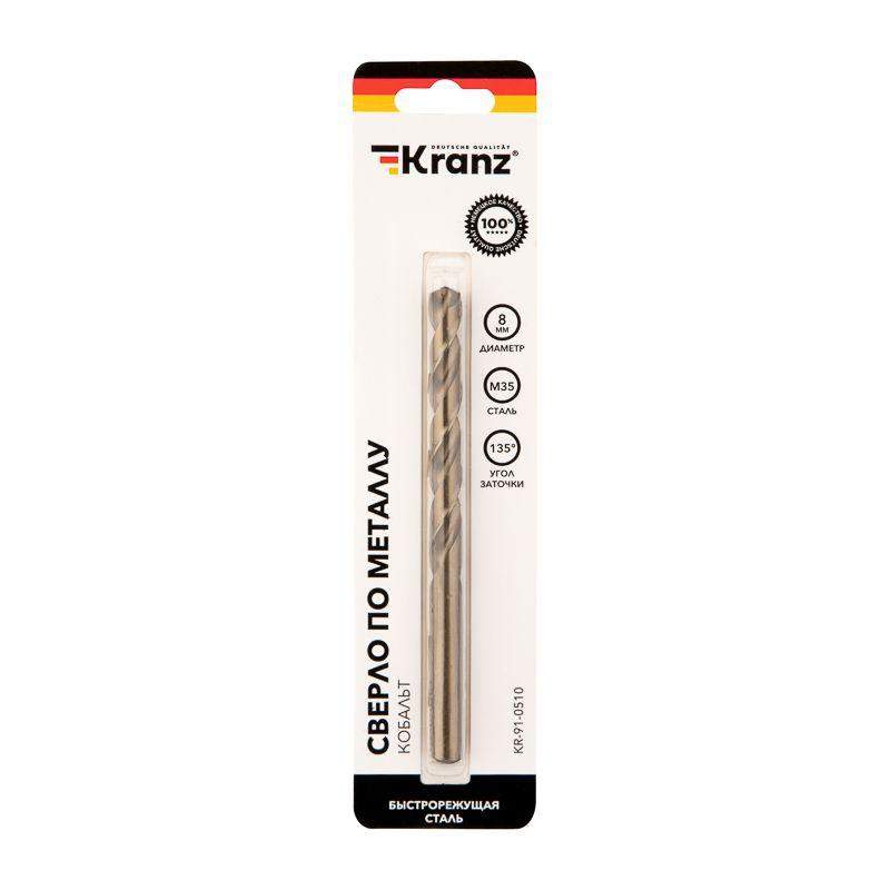 –Сверло по металлу 8мм "Кобальт" (сталь HSS-Co 5% M35 P6M5K5) DIN 338 (блист.1шт) Kranz KR-91-0510