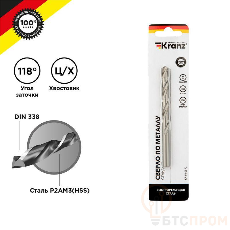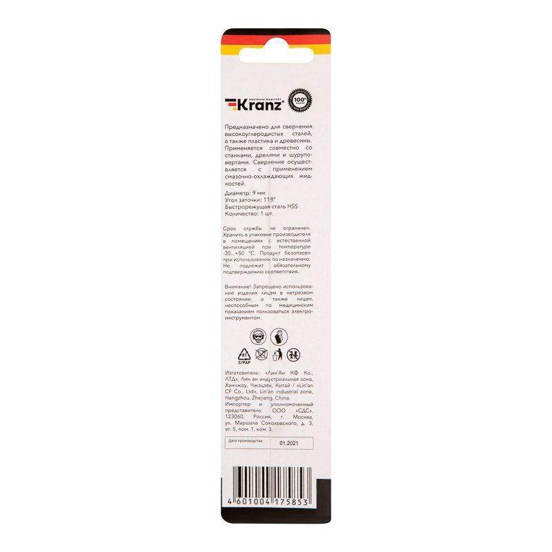 Сверло по металлу 9.0мм HSS DIN 338 (уп.1шт) Kranz KR-91-0572 фото в каталоге от BTSprom.by