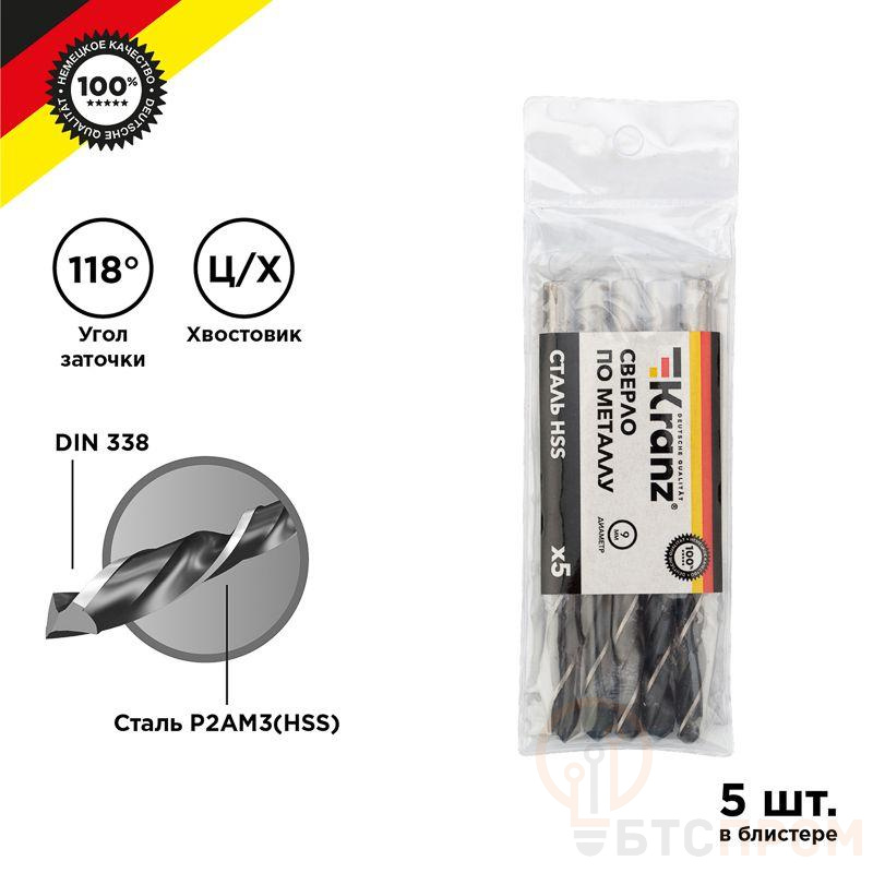 Сверло по металлу 9.0мм HSS DIN 338 (уп.5шт) Kranz KR-91-0627 фото в каталоге от BTSprom.by