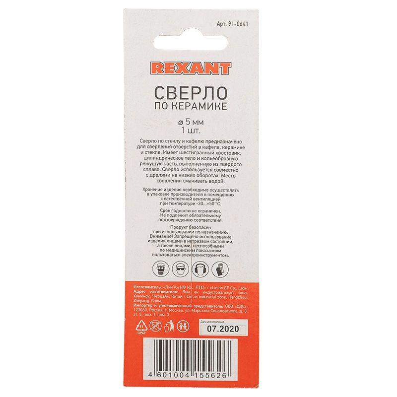 Сверло по стеклу и керамике 5мм (шестигранный хвостовик) Rexant 91-0641 фото в каталоге от BTSprom.by