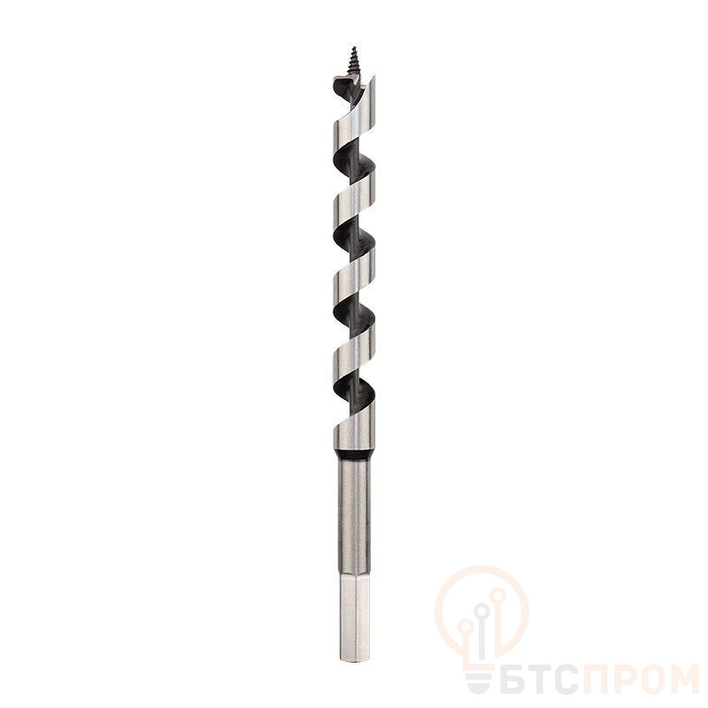 Винтовое сверло предназначено для сверления отверстий под нагели, дюбели. Используется при выполнении строительных, ремонтных и столярных работ. Сверло выполнено из закаленной инструментальной стали, что повышает износостойкость и долговечность инструмента. Центрирующее острие на конце рабочей части позволяет удобно засверливаться в материал и уменьшает осевую нагрузку, шнековая спираль Левиса обработана до зеркального блеска, из-за чего отверстия получаются гладкими, а стружка отводится более эффективно. Хвостовая часть, выполненная в виде шестигранника, надежно фиксирует сверло в патроне инструмента. Устанавливается на дрель или шуруповерт с высоким крутящим моментом.