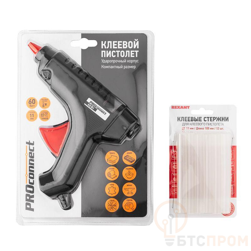 Набор состоит из клеевого пистолета и клеевых стержней. Клеевой пистолет предназначен склеивания поверхностей различных материалов, герметизации стыков и швов, фиксации проводов с помощью расплавленной клеевой массы. Используется в декорировании, в изготовлении поделок и моделировании; будет полезен как на производстве, так и в быту. Корпус пистолета изготовлен из ударопрочной пластмассы, поэтому инструмент служит дольше, а металлическая скоба позволяет устанавливать пистолет в режиме ожидания. Сопло пистолета защищено клапаном от произвольного вытекания клея и оснащено термостойким силиконовым протектором, минимизирующим риск ожогов при случайном контакте и защищающим рабочую зону от высокой температуры. Пистолет используется с клеевыми стрежнями диаметром 11 мм. Клеевые стержни, которые входят в набор, изготовлены из ЭВА, и являются полностью экологичными и безопасными, а комплекта из 12 стержней длиной 100 мм хватит для выполнения небольшого объема работ.
