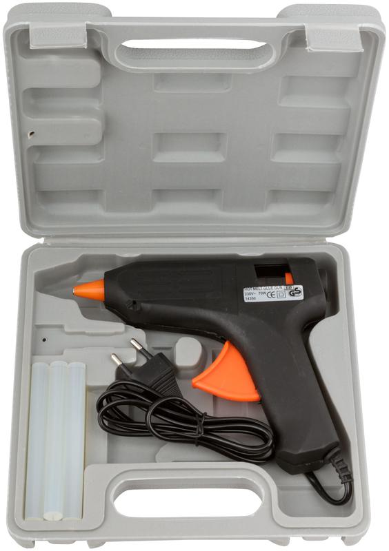 Пистолет клеевой FIT IT в пластиковом чемоданчике предназначен для склеивания дерева, бумаги, ДСП, линолеума и пластика. Используется с клеевым стержнем. Курок обеспечивает точный контроль за расходом клея. Силиконовая накладка на сопло предотвращает получение ожогов. Корпус изготовлен из термостойкого пластика. Эргономичная форма рукоятки обеспечивает удобный хват. Возможность работы в труднодоступных местах достигается за счет компактного размера пистолета. Стальная подставка позволяет быстро устанавливать пистолет в перерывах между склеиванием. Пластиковый чемоданчик обеспечивает удобство хранения и транспортировки.