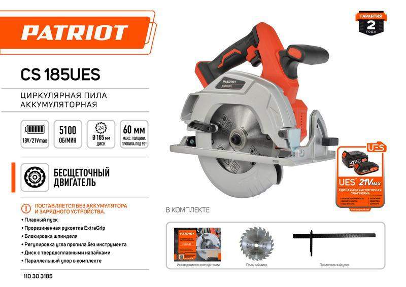–Пила циркулярная аккумуляторная бесщеточная CS 185UES PATRIOT 110303185