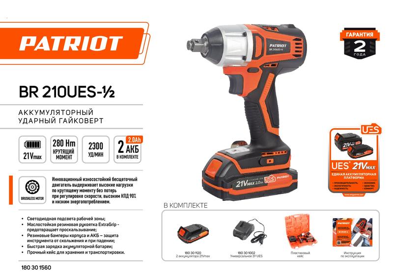 Гайковерт аккумуляторный ударный BR 210Li 1/2 UES BL 2 АКБ Li-ion 18В 2.0А.ч 280Нм патрон 1/2 зарядка за 1ч бесщетовой ЭД (большой кейс) PATRIOT 180301560