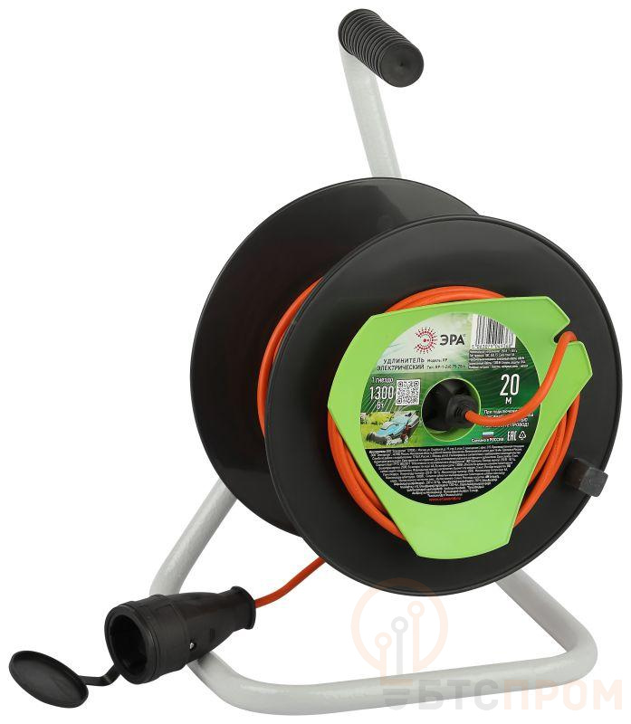 Удлинитель силовой на пластиковой катушке ЭРА RP-1-2x0.75-20m без заземления, 1 розетка, провод ПВС 2х0,75м2, 20 м. Мощность 6А/1300Вт. Степень защиты IP44. Используется для работы на строительных площадках или дачных участках. Удобен при работе с приборами, находящимися удаленно от стационарной розетки. Например, газонокосилки, электрические, пилы, триммеры или электродрели. Провод в удлинителях Эра сделан из 100% меди, что делает его абсолютно пожаробезопасным. Рама удлинителя сделана из высокопрочной стали, а пластиковой корпус выполнен с применением негорючих добавок.