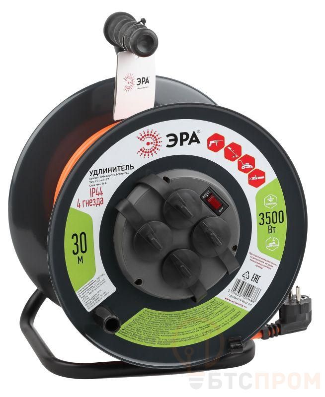Удлинитель силовой на металлической катушке ЭРА RMx-4es-3x1.5-30m-IP44 с заземлением, с выключателем, ПВС 3x1,5м2, 4 розетки, 30м, степень защиты IP44. Мощность 16А/3500Вт. Используется для работы на строительных площадках или дачных участках. Удобен при работе с приборами находящимися удаленно от стационарной розетки. Например, газонокосилки, электрические, пилы, триммеры или электродрели. Провод в удлинителях Эра сделан из 100% меди, что делает его абсолютно пожаробезопасным. Рама удлинителя сделана из высокопрочной стали.
