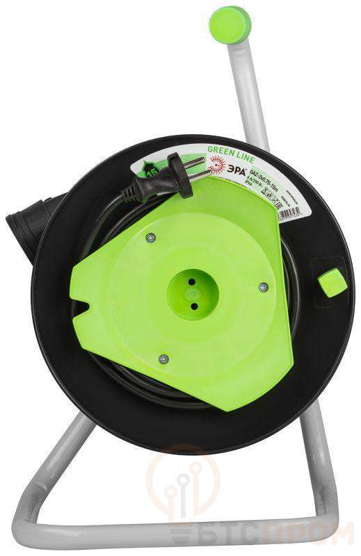 Удлинитель силовой ЭРА GREEN LINE на пластиковой катушке GAZ-2x0.75-15m, 1 розетка без заземления. Провод 15м ПВС 2х0,75мм2. Мощность 6А/1300Вт. Используется для работы на строительных площадках или дачных участках. Удобен при работе с приборами, находящимися удаленно от стационарной розетки. Например, газонокосилки, электрические, пилы, триммеры или электродрели. Рама удлинителя сделана из высокопрочной стали, а пластиковой корпус катушки выполнен с применением негорючих добавок.
