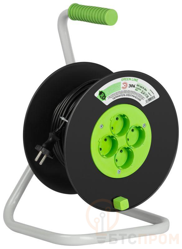 Удлинитель силовой ЭРА GREEN LINE на пластиковой катушке KAT-2x0.75-30m, 4 розетки без заземления. Провод ПВС 2х0,75мм2, 30м. Мощность 6А/1300Вт. Используется для работы на строительных площадках или дачных участках. Удобен при работе с приборами, находящимися удаленно от стационарной розетки. Например, газонокосилки, электрические, пилы, триммеры или электродрели. Рама катушки сделана из высокопрочной стали, а пластиковой корпус катушки выполнен с применением негорючих добавок.