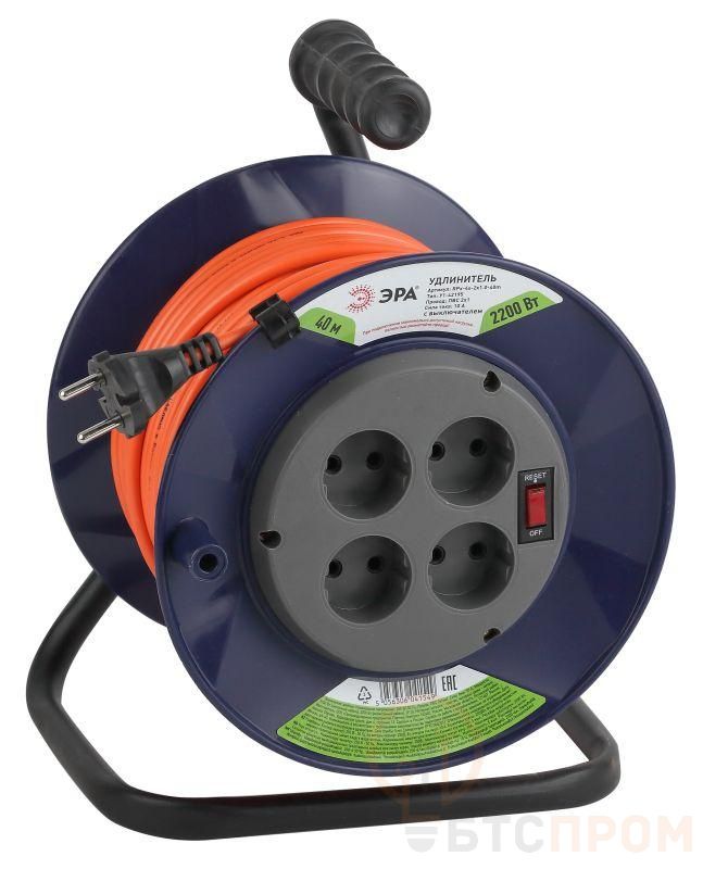 Удлинитель силовой на пластиковой катушке ЭРА RPx-4s-2x1.0-40m с заземлением, с выключателем, ПВС 2х1м2, 4 розетки, 40 м. Мощность 10А/2200Вт. Используется для работы на строительных площадках или дачных участках. Удобен при работе с приборами находящимися удаленно от стационарной розетки. Например, газонокосилки, электрические, пилы, триммеры или электродрели. Провод в удлинителях Эра сделан из 100% меди, что делает его абсолютно пожаробезопасным. Рама удлинителя сделана из высокопрочной стали а пластиковой корпус выполнен с применением негорючих добавок.