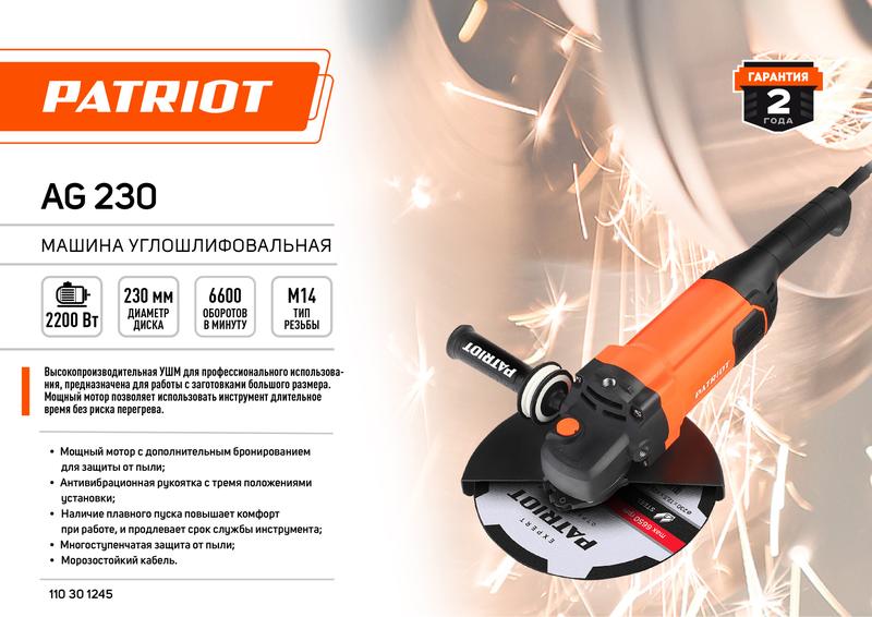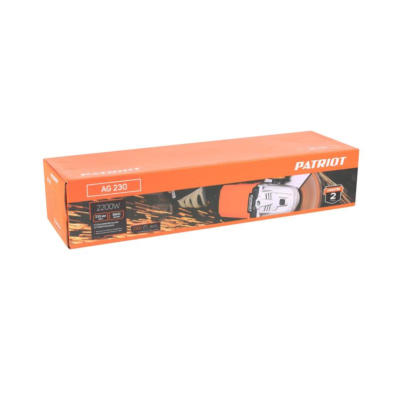 Машина шлифовальная угловая УШМ AG 230 2350Вт тонкая задняя рукоятка корпус пылезащ. диск 230мм PATRIOT 110301245