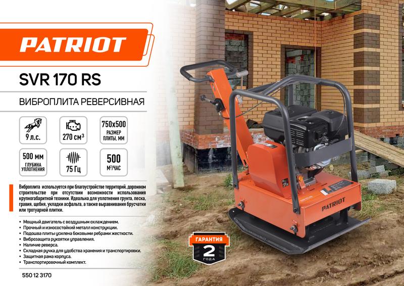 Виброплита PATRIOT SVR 170 RS используется при благоустройстве территорий, прокладке коммуникаций, подготовке фундаментов, дорожном строительстве. Мощный двигатель с воздушным охлаждением Прочный и износостойкий металл конструкции Подошва плиты усилена боковыми ребрами жесткости Виброзащита рукоятки управления Наличие реверса Складная ручка для удобства хранения и транспортировки Защитная рама корпуса Транспортировочный комплект