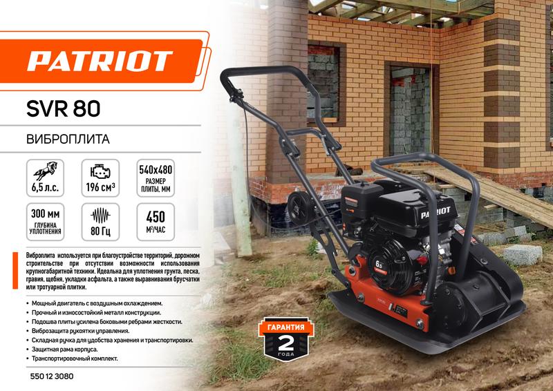 Виброплита PATRIOT SVR 80 используется при благоустройстве территорий, прокладке коммуникаций, дорожном строительстве при невозможности использования крупногабаритной техники. Идеальна для уплотнения грунта, песка, гравия, щебня, укладки асфальта, а также выравнивания брусчатки или тротуарной плитки.· Мощный двигатель с воздушным охлаждением· Прочный и износостойкий металл конструкции· Подошва плиты усиленаб · Виброзащита рукоятки управления · Складная ручка для удобства хранения и транспортировки · Защитная рама корпуса · Транспортировочный комплект