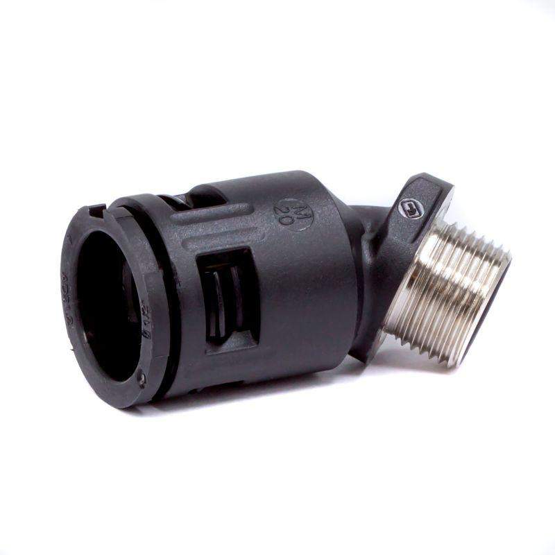 Муфта предназначена для ввода гофрированных полиамидных труб номинальным диаметром 17мм под углом 45° в корпуса шкафов, щитков, распаечных коробок, которые подвергаются механическим и вибрационным воздействиям в процессе эксплуатации. Металлическая резьба позволяет жестко зафиксировать муфту в оборудовании и не допустить разбалтывания соединения. Материал корпуса - полиамид, материал металлической резьбы - никелированная латунь. Не содержит галогенов.