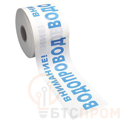 Сигнальная лента с предупреждающим текстом «Внимание! Водопровод». Предназначена для распознавания водоразводящих сетей в грунте. Представляет собой белую полиэтиленовую полосу шириной 200 мм с синей надписью «Внимание! Водопровод».