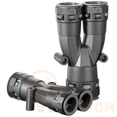 Разветвитель используется для организации V-образного разветвления системы труб. При этом появляется возможность организовать переход с одного диаметра труб на другой. Аксессуар не содержит в составе галогенов, а потому его можно безопасно применять даже в местах массового пребывания людей. Совместимый диаметр труб - 36 мм на основании и 29 мм - на ответвлениях. Материал - полиамид. Цвет - черный.
