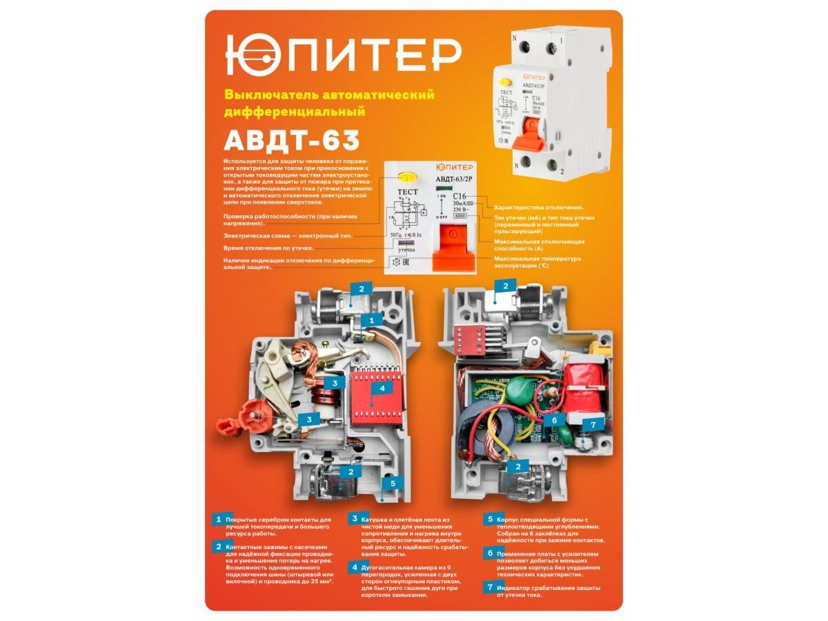 Выключатель дифференциальный автоматич. АВДТ-63/2P C20 30мА 6кА тип А ЮПИТЕР (электронный тип) JP7522-20