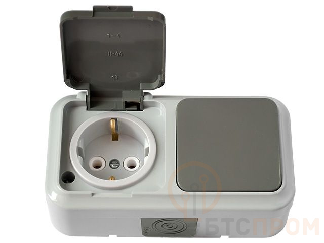 Блок выкл. 1 клав. + розетка (открытая, с/з, брызг. защ.) серая, Пралеска Аква, Bylectrica (IP54 пылебрызгозащищенные) В-РЦ-657(03)