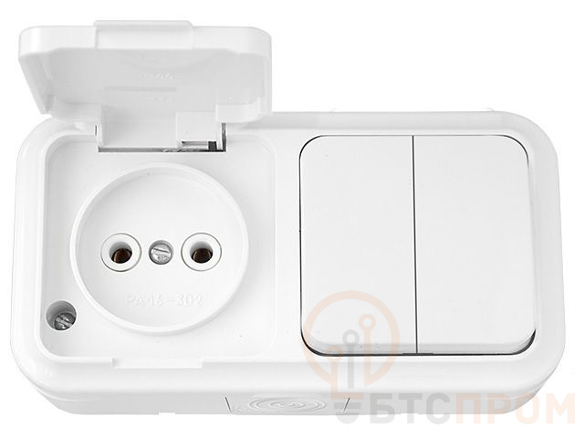 Блок выкл. 2 клав. + розетка (открытая, б/з, брызг. защ.) белая, Пралеска Аква, Bylectrica (IP54 пылебрызгозащищенные) 2В-РЦ-655