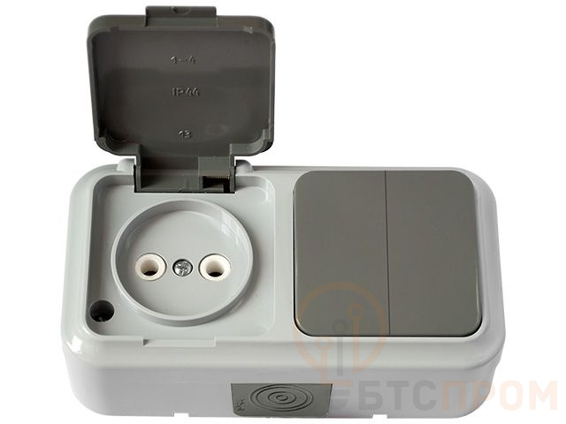 Блок выкл. 2 клав. + розетка (открытая, б/з, брызг. защ.) серая, Пралеска Аква, Bylectrica (IP54 пылебрызгозащищенные) 2В-РЦ-655(03)