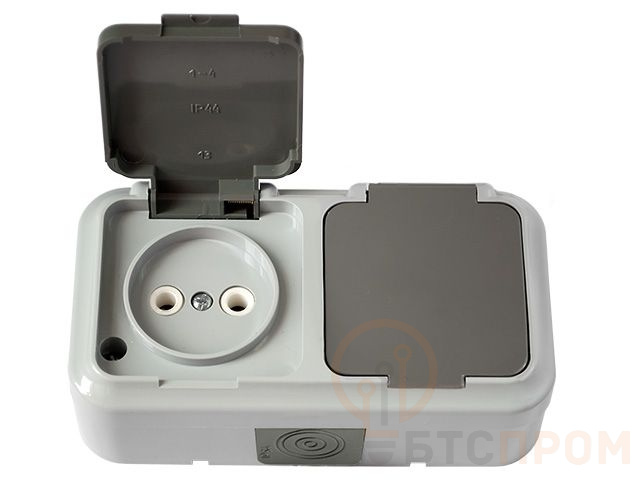 Розетка 2-ая (открытая, б/з, брызг. защ.) серая, Пралеска Аква, Bylectrica (IP54 пылебрызгозащищенные) РА16-302(03)