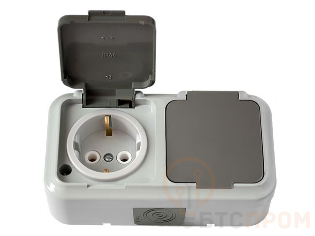 Розетка 2-ая (открытая, с/з, брызг. защ.) серая, Пралеска Аква, Bylectrica (IP54 пылебрызгозащищенные) РА16-303(03)