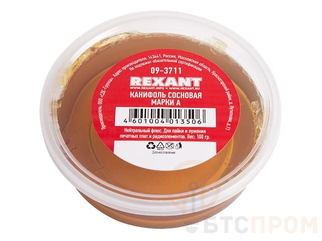 Канифоль сосновая марки А 100 г REXANT предназначена для удаления тонких и нестойких оксидов с поверхности под пайку, улучшения растекания жидкого припоя при пайке печатных плат и радиокомпонентов.