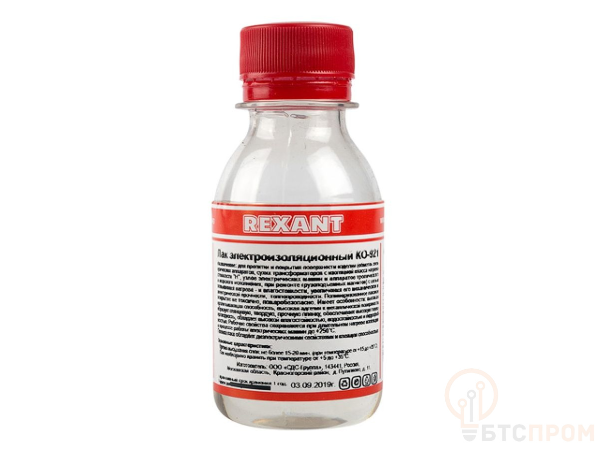 Лак электроизоляционный KO-921 100 мл REXANT предназначен для пропитки и покрытия поверхности изделий (обмоток электрических аппаратов, сухих трансформаторов с изоляцией класса нагревостойкости "Н", узлов электрических машин и аппаратов тропического и морского исполнения, при ремонте грузоподъемных магнитов) с целью повышения нагрево- и влагостойкости, увеличения его механической и электрической прочности и теплопроводности.