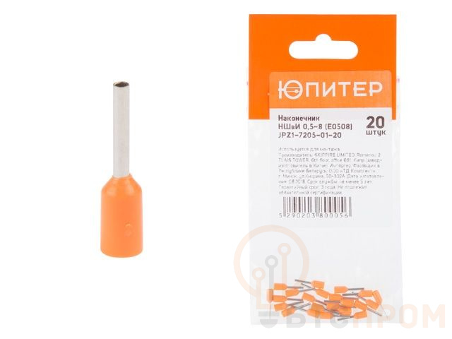 Наконечник-гильза НШвИ 0,5-8 (E0508) (20 шт) Юпитер (с изолированным фланцем) (ЮПИТЕР) JPZ1-7205-01-20