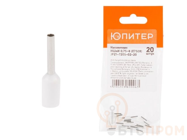 Наконечник-гильза НШвИ 0,75-8 (E7508) (20 шт) Юпитер (с изолированным фланцем) (ЮПИТЕР) JPZ1-7205-02-20