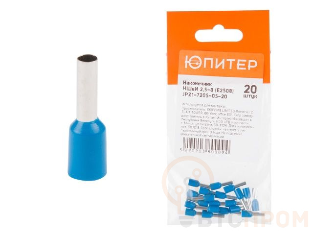 Наконечник-гильза НШвИ 2,5-8 (E2508) (20 шт) Юпитер (с изолированным фланцем) (ЮПИТЕР) JPZ1-7205-05-20