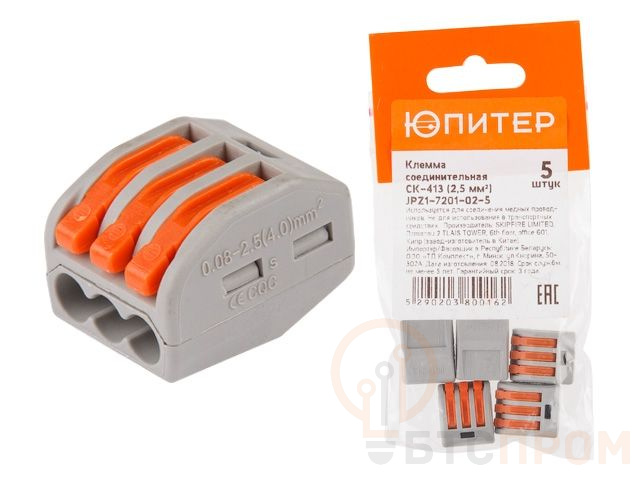 Сечение подключаемого проводника: 0,1 - 2,5 мм2 (для одножильных), 0,08 - 4 мм2 (для многожильных);