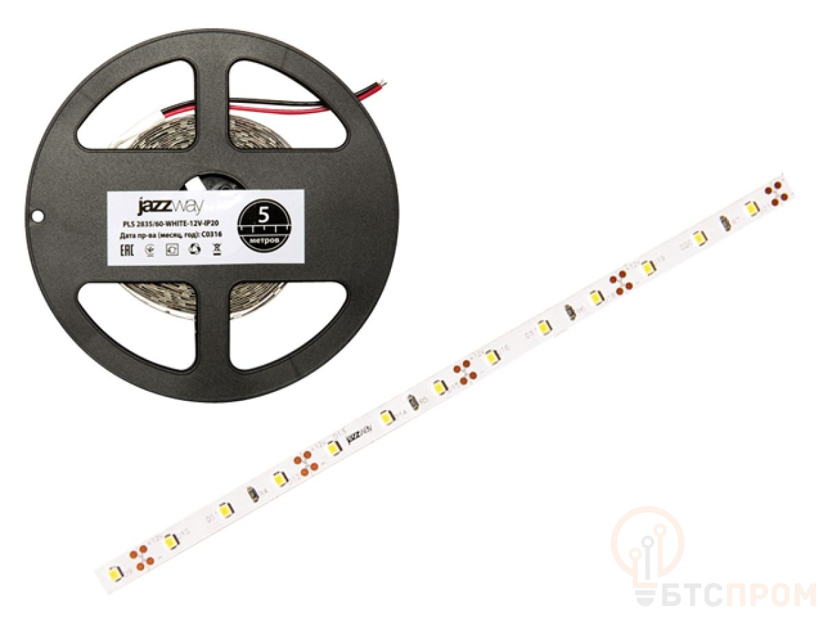 Лента светодиодная PLS 2835/60 (6 Вт/м, 480 Лм/м, IP20, 12В (5 м в уп.) красная JAZZWAY (60 диод/м, красный свет, 8 мм) 5000315