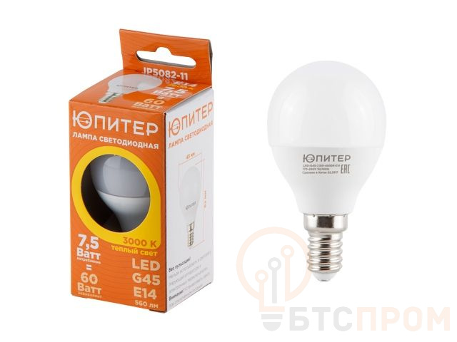 Лампа светодиодная G45 ШАР 7,5 Вт 170-240В E14 3000К ЮПИТЕР (60 Вт аналог лампы накал., 560Лм, теплый белый свет) JP5082-11