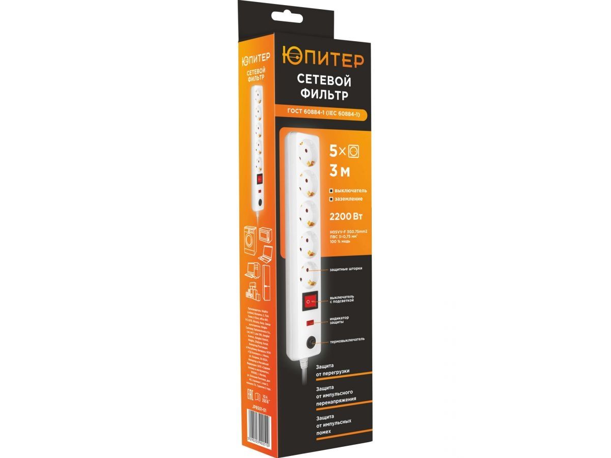 Сетевой фильтр ЮПИТЕР изготовлен только из качественных материалов в соответствии с ГОСТ60884-1 и рекомендуется для подключения дорогостоящего и чувствительного оборудования (компьютер, холодильник, телевизор, аудио- видео- техника, оргтехника и др.), у которого нет встроенной защиты.
