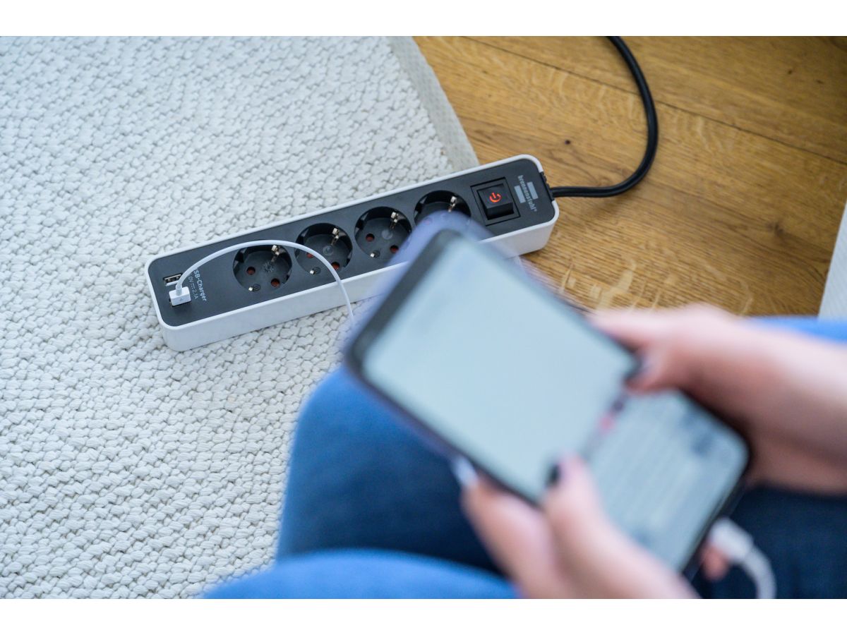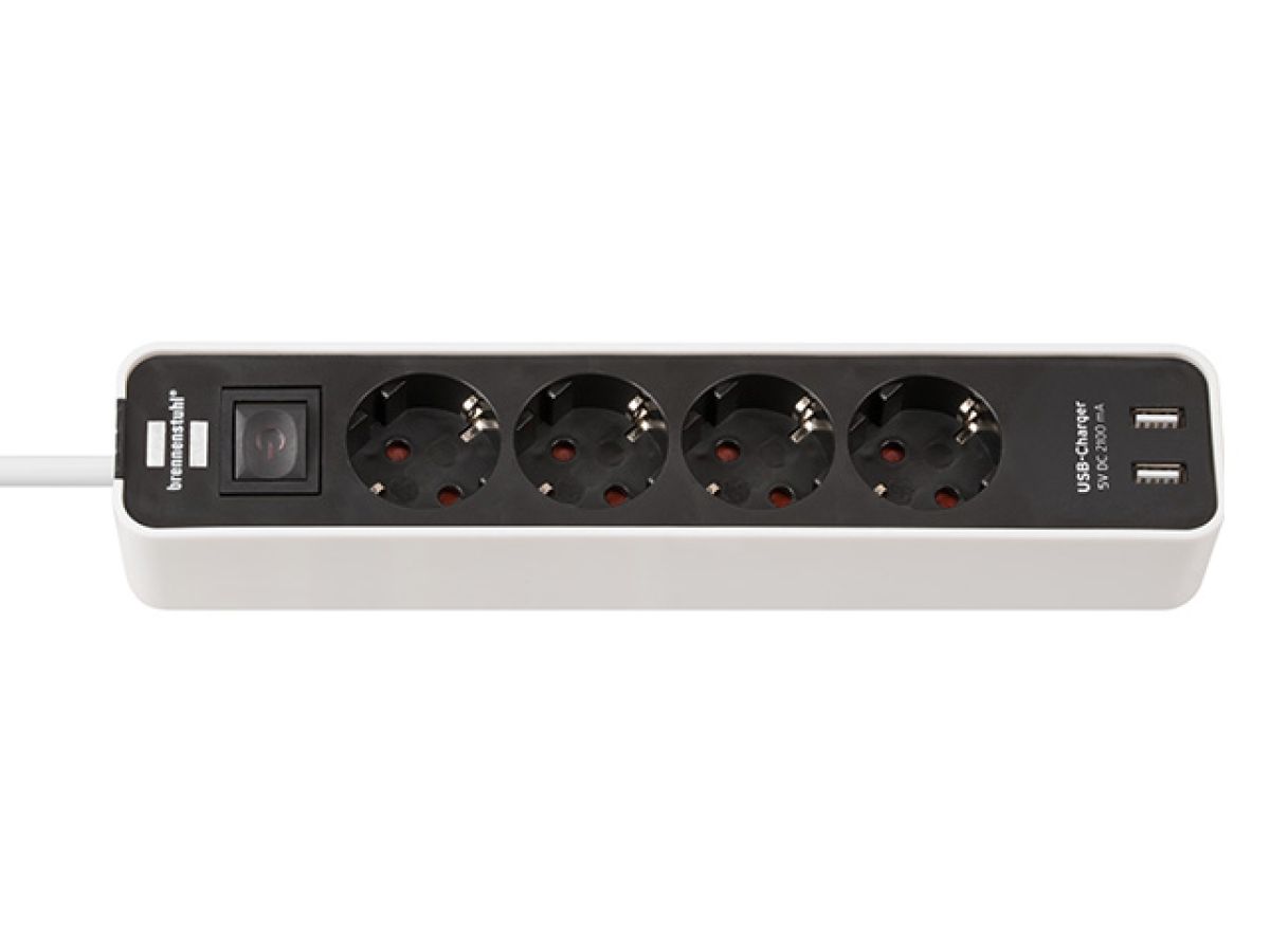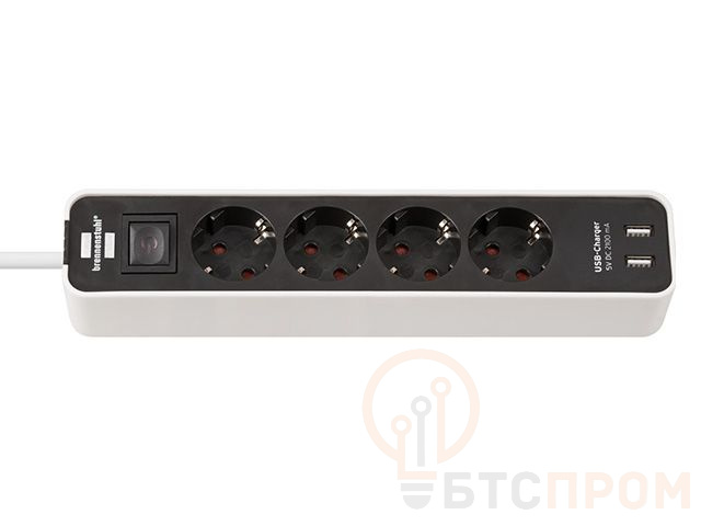 Удлинитель 1.5м (4 роз., 3.3кВт, с/з, 2 USB порта, выкл., ПВС) черный/белый Brennenstuhl Eco-Line (провод 3х1,5мм2, сила тока 16А, 2 USB порта, с/з - с заземляющим контактом) 1153240026