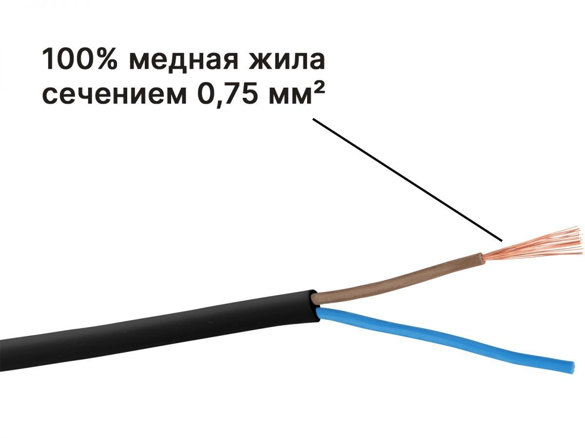 Реальное сечение провода из чистой меди гарантирует работоспособность удлинителя при подключении нагрузки до 2200Вт.
